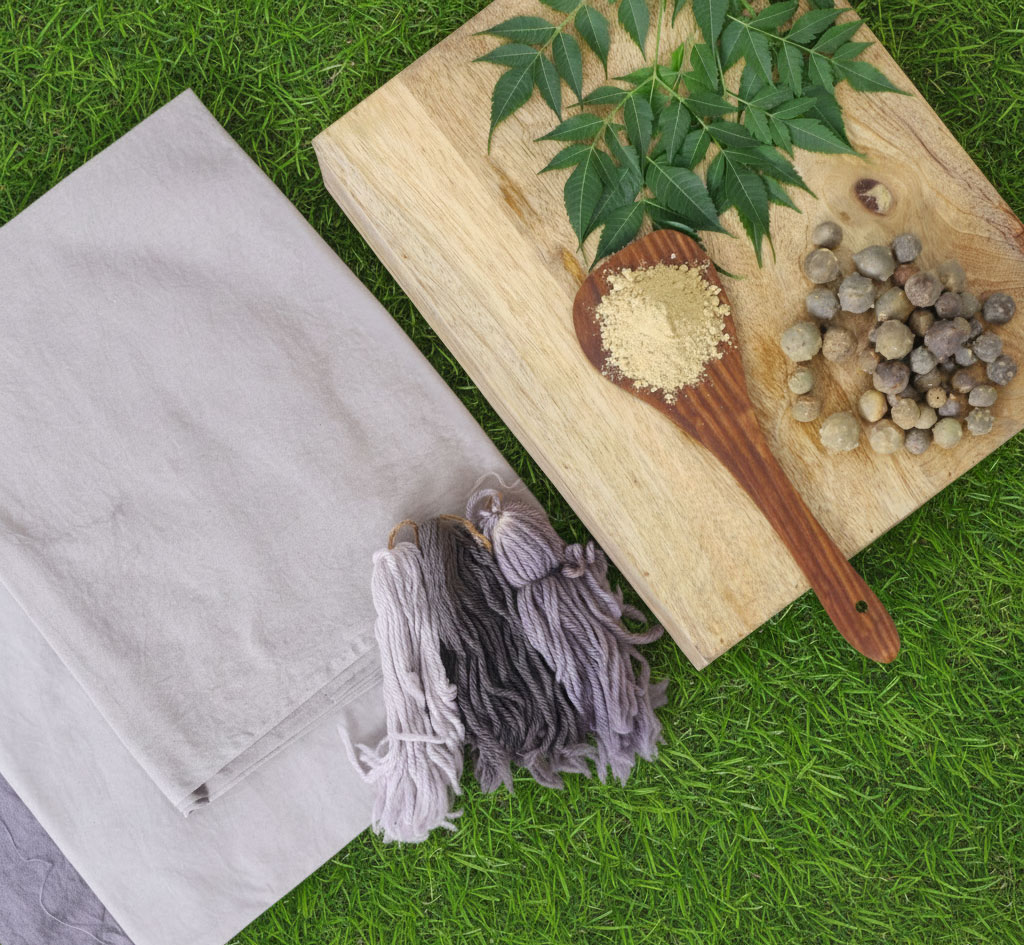 If you take iron water or ferrous sulphate instead of Alum after treating the fabric with Gallnut you will achieve different hues of gray.
